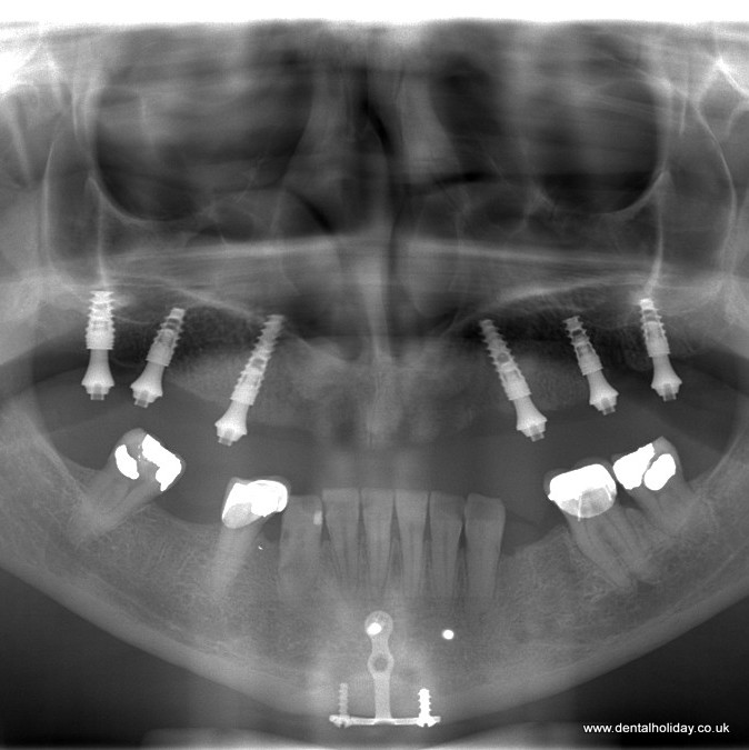 She came over with her daughter to visit us for a dramatic change. As you can see from her X-ray, there are no teeth in the upper jaw, and we placed 6 dental implants witch eventually supported 12 new teeth.